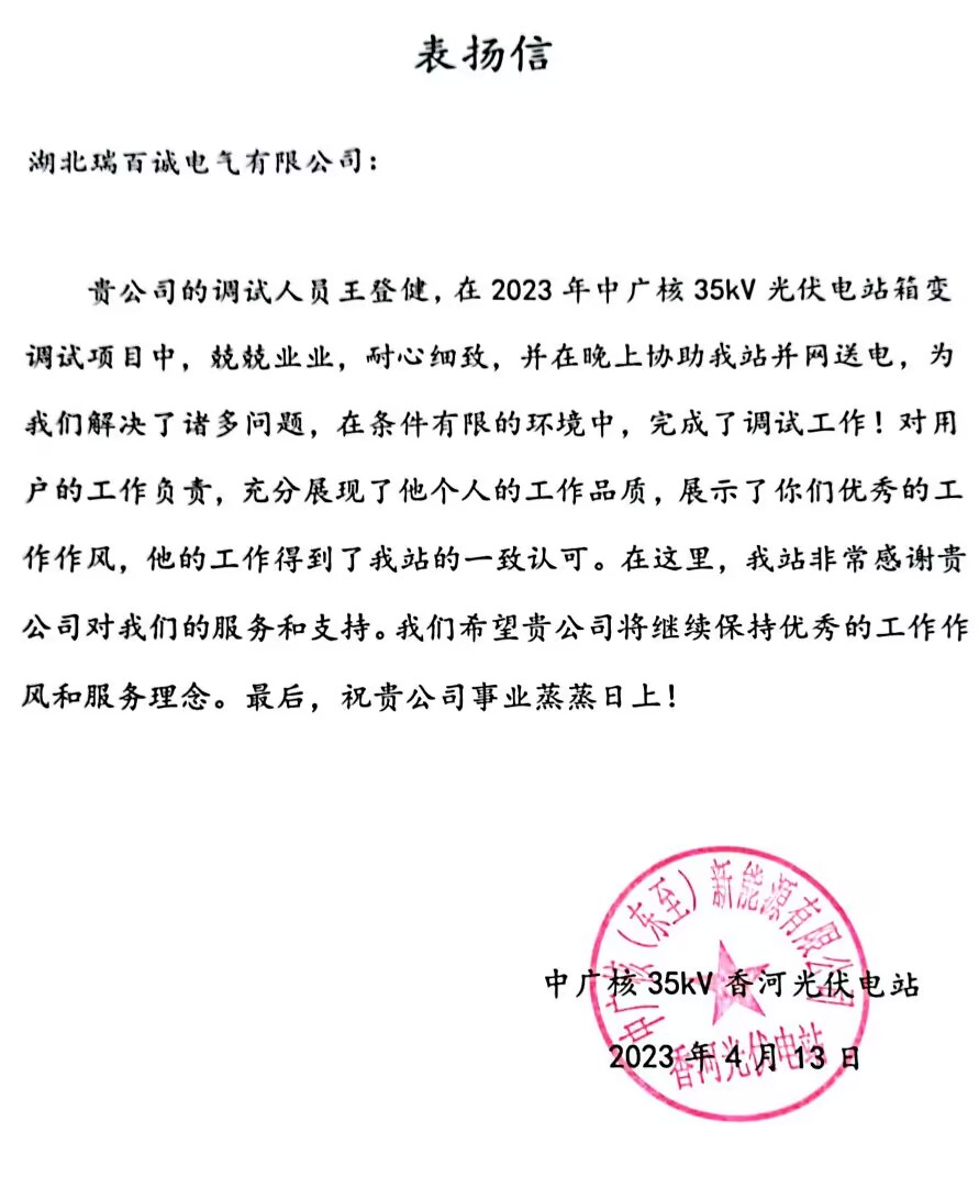 貴公司的調(diào)試人員王登健,在2023年中廣核35kV光伏電站箱變調(diào)試項(xiàng)目中,兢兢業(yè)業(yè),耐心細(xì)致,并在晚上協(xié)助我站并網(wǎng)送電,為我們解決了諸多問題,在條件有限的環(huán)境中,完成了調(diào)試工作!對用戶的工作負(fù)責(zé),充分展現(xiàn)了他個(gè)人的工作品質(zhì),展示了你們優(yōu)秀的工作作風(fēng),他的工作得到了我站的一致認(rèn)可。在這里,我站非常感謝貴公司對我們的服務(wù)和支持。我們希望貴公司將繼續(xù)保持優(yōu)秀的工作作風(fēng)和服務(wù)理念。最后,祝貴公司事業(yè)蒸蒸日上!